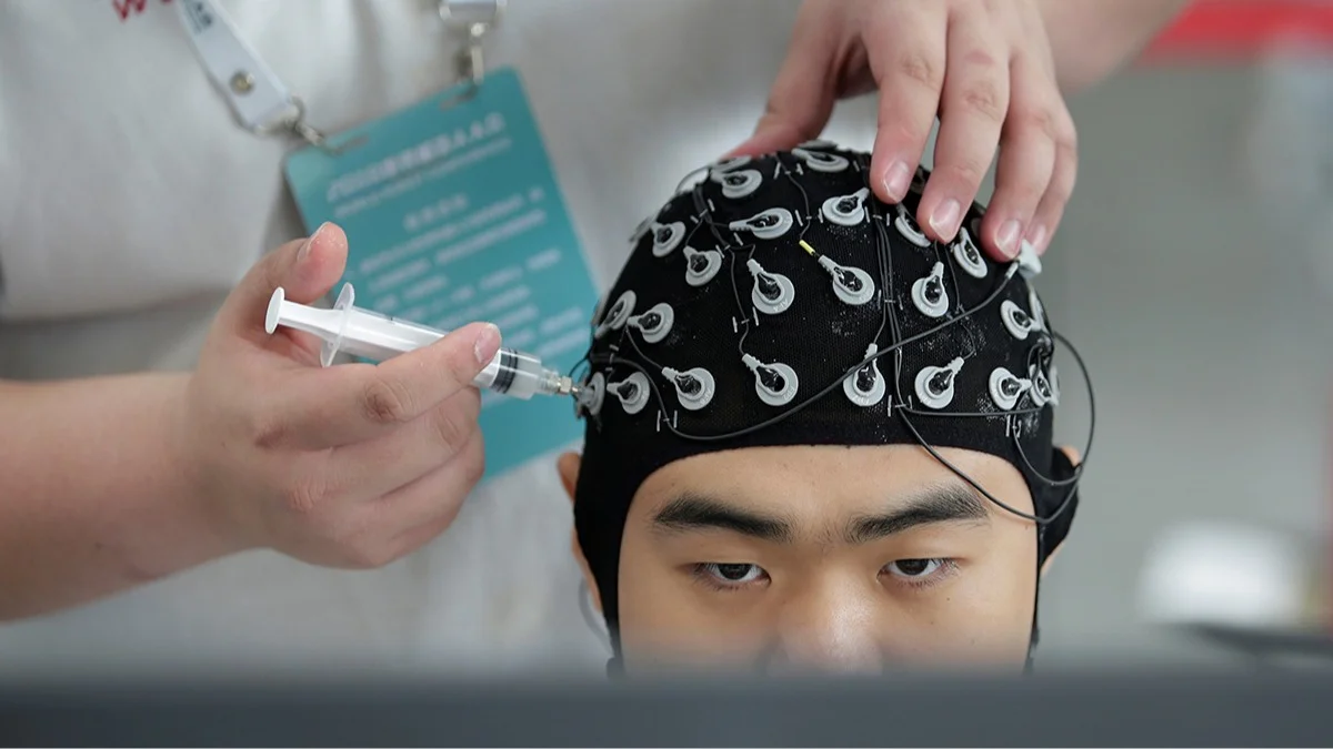Мужчина демонстрирует роботизированную руку с интерфейсом мозг-компьютер, 8-й Китайская международная выставка импорта (CIIE) в Шанхае, 7 ноября 2025 года. Фото: Hector Retamal / AFP / Scanpix / LETA