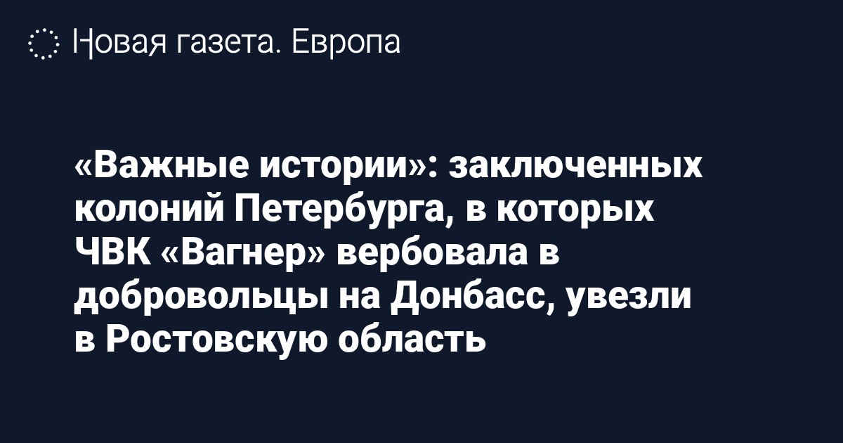 4 июля «Важные истории» со ссылкой на родственников осужденных рассказали, что ЧВК «Вагнер» предложила заключенным двух колоний Петербурга «добровольно» поехать на Донбасс, чтобы «помогать обнаруживать нацистов». По словам источников издания, «добровольцам» обещали выплатить 200 тысяч рублей за полгода службы, а затем амнистировать, если получится вернуться живыми.