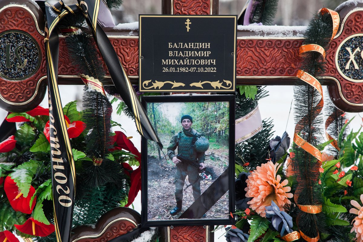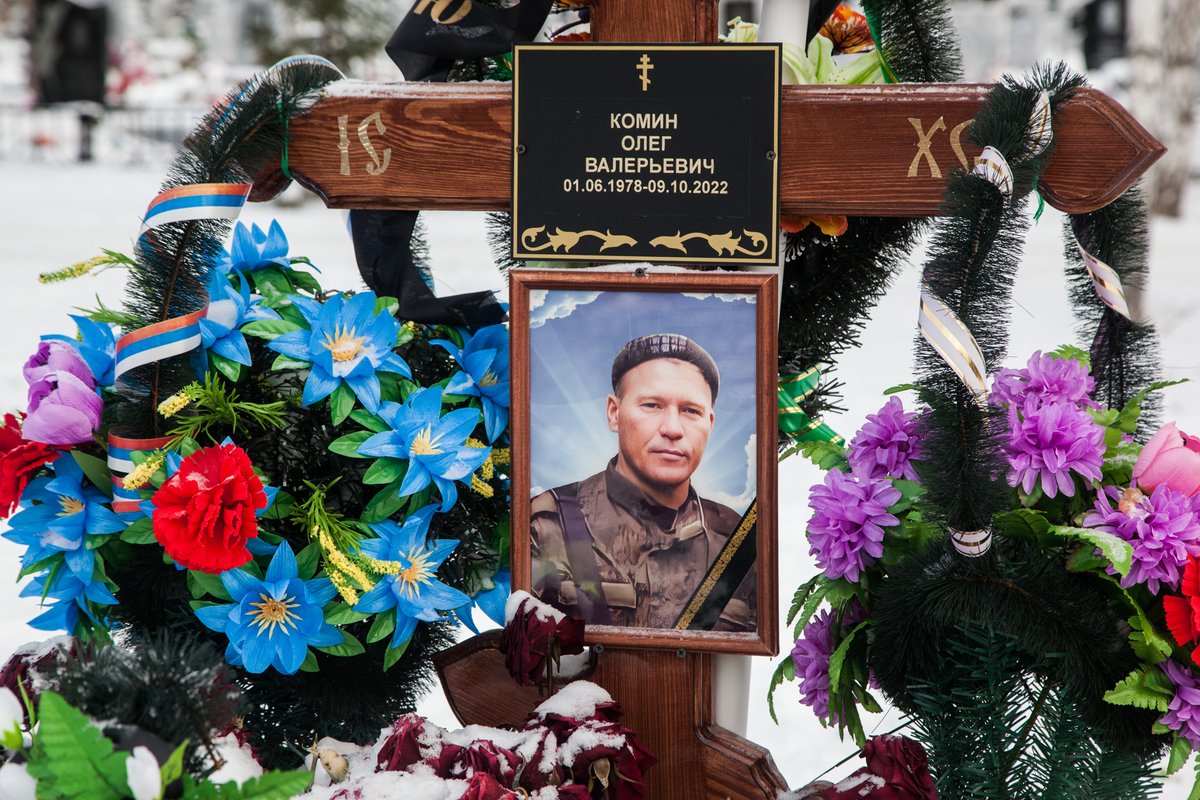 На морозном ветру развеваются флаги «Своих не бросаем», «После нас тишина», «Граница на замке». С Иваном (имя изменено), 40-летним местным жителем, мы ходим между свежих могил по заснеженному кладбищу города Невьянск. Здесь много бумажных цветов, пластиковые венки еще не выцвели. Почти одинаковые кресты на пяти могилах у центрального входа. За ними оставлена земля на перспективу, «обычных» людей хоронят дальше.