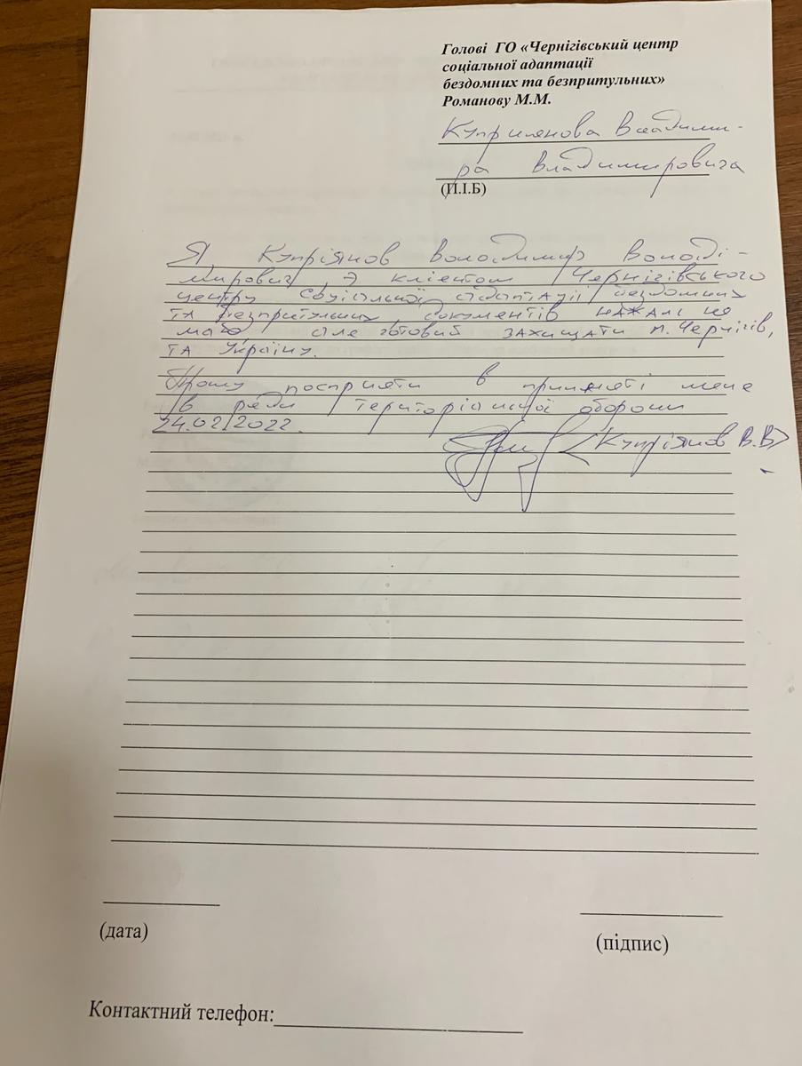 «Я, Куприянов Владимир Владимирович, являюсь клиентом Черниговского центра социальной адаптации бездомных и бесприютных, к сожалению, не имею документов, но готов защищать город Чернигов и Украину. Прошу посодействовать приему меня в ряды территориальной обороны».