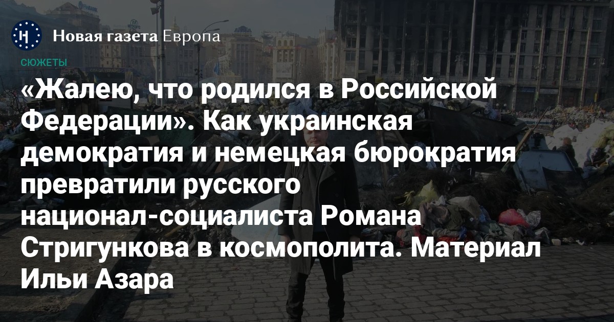 Белгородский национал-социалист Роман Стригунков уехал на Майдан, когда на родине ему пригрозили уголовным делом. Украина предоставила ему защиту, но, когда началась война, Стригунков бежал в Европу, бросив в Киеве свой российский паспорт. Уже несколько месяцев он пытается получить в Германии ВНЖ, но немецкие бюрократы требуют хоть каких-то документов, заставляя скитаться по стране. Возвращаться в Киев за паспортом Стригунков отказывается, а только бесконечно на всех жалуется. Журналист Илья Азар рассказывает историю русского националиста, который, по его словам, «трансформировался в сторону либерала и космополита», но при этом Украину считает «третьесортной страной» и мечтает остаться в Европе, работать тату-мастером и жить обывательской жизнью.