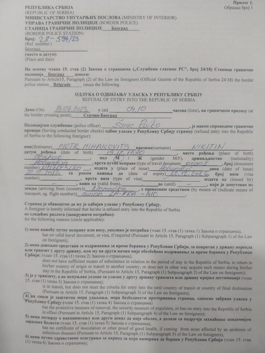 Антивоенный активист Петр Никитин возвращался в Сербию после недельного отпуска в Португалии. Пограничники три с половиной часа держали Никитина в зоне прилета и ждали информации от Агентства безопасности и информации Сербии (БИА). В итоге активисту вручили решение о запрете въезда в Сербию. Это первый подобный случай, о котором известно на данный момент.