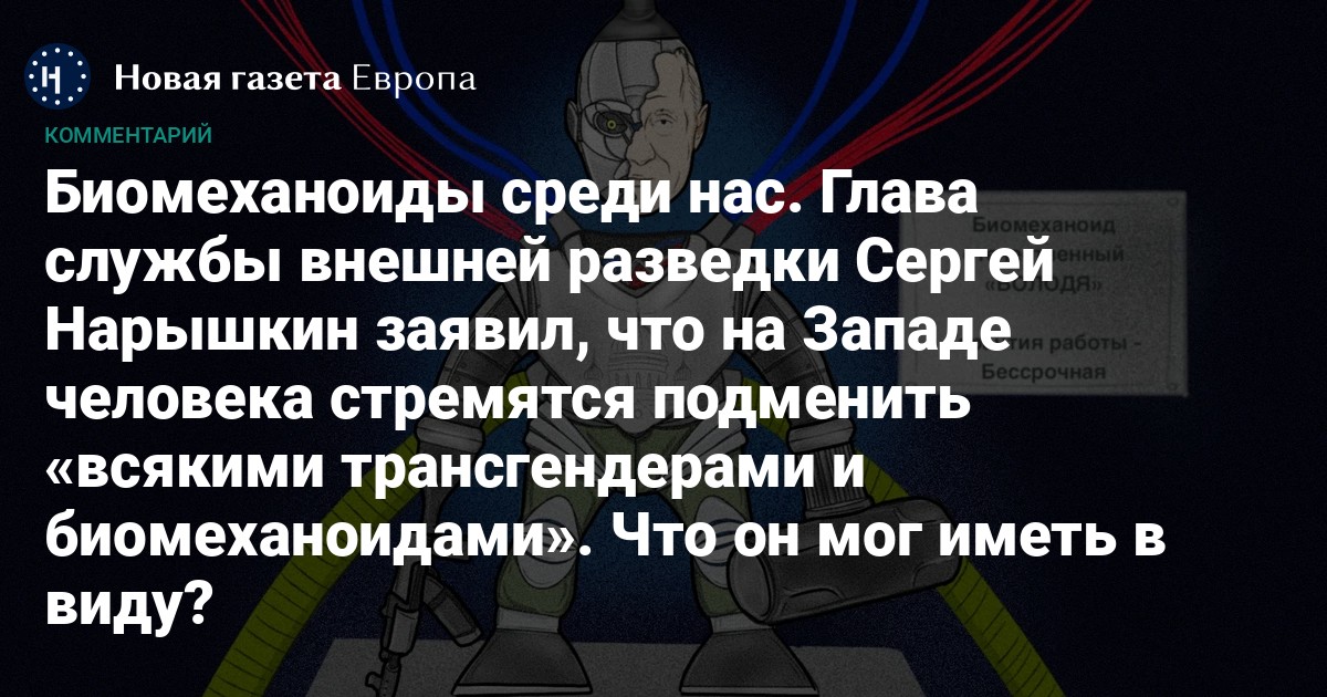 Но довольно сарказма, его каждый легко найдет в запрещенных социальных сетях. Постараемся отнестись к заявлению Нарышкина совершенно серьезно — как к важному политическому событию. Ведь в политике сказанное часто важнее фактического, так как позволяет судить о мотивах и намерениях говорящего. Помните, например, как 21 февраля 2022 года, перед самым вторжением, тот же Нарышкин выдал перед телекамерами главную военную тайну — план присоединения к России новых украинских территорий. Разведчик просто не догадывался, что, по мнению начальника, это еще для кого-то тайна. Получилось неудобно, но познавательно. Извлечь знание из упоминания о биомеханоидах будет, конечно, немного труднее, но мы попытаемся.