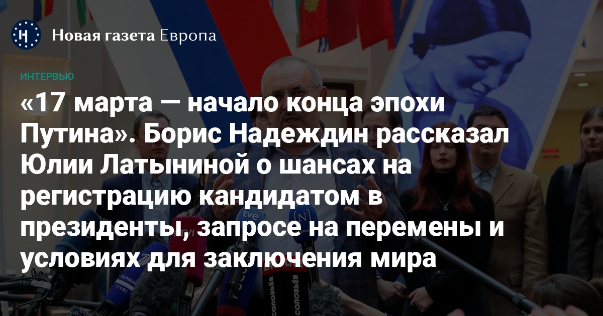 В интервью Юлии Латыниной Надеждин рассказал о том, могут ли его зарегистрировать, как он планирует договариваться с Украиной и что думает о стратегии голосования не за его личность, а за идею перемен.