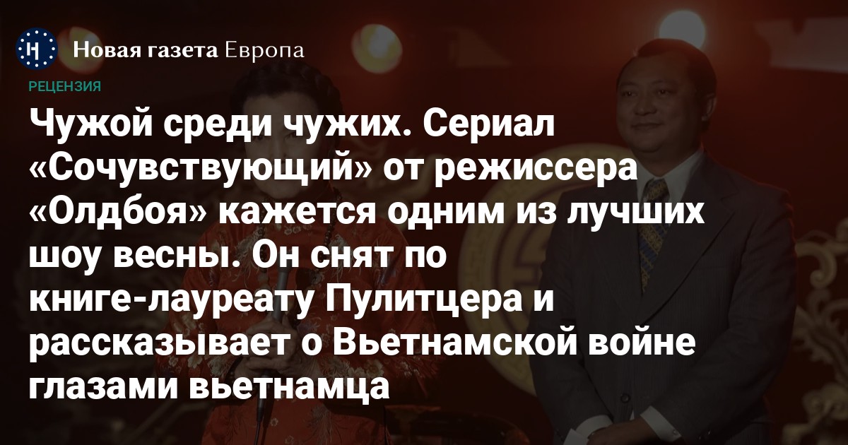«Сочувствующий» — шпионский сериал, основанный на удостоенном Пулитцеровской премии романе писателя Вьет Тхань Нгуена. Появление масштабной экранизации произведения, где нарратором выступает вьетнамец, — результат набирающего в США обороты тренда на азиатскую культуру (в этот же тренд вписывается сериал «Сегун»). Небывалая лояльность к не-американским постановщикам, в данном случае, к южнокорейцу Пак Чхан-уку, позволила создать сериал, где чуть ли не впервые для американской аудитории предлагается взглянуть на ту войну с точки зрения самих вьетнамцев.