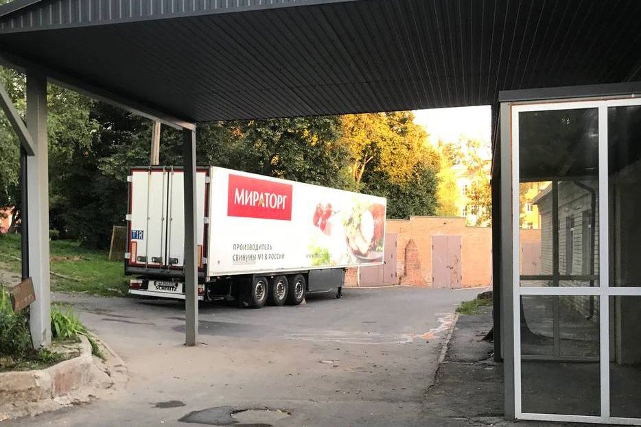 Фуры компании «Мираторг» около морга в Курске