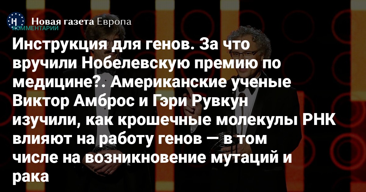 В понедельник, 7 октября, вручили Нобелевскую премию по физиологии и медицине — ее лауреатами стали Виктор Амброс (Медицинская школа Массачусетского университета ) и Гэри Рувкун (Гарвардская медицинская школа, Бостон) за открытие микроРНК и ее роли в посттранскрипционной регуляции генов. Это открытие позволяет понять, как работают гены, почему образуются мутации и развивается рак.
