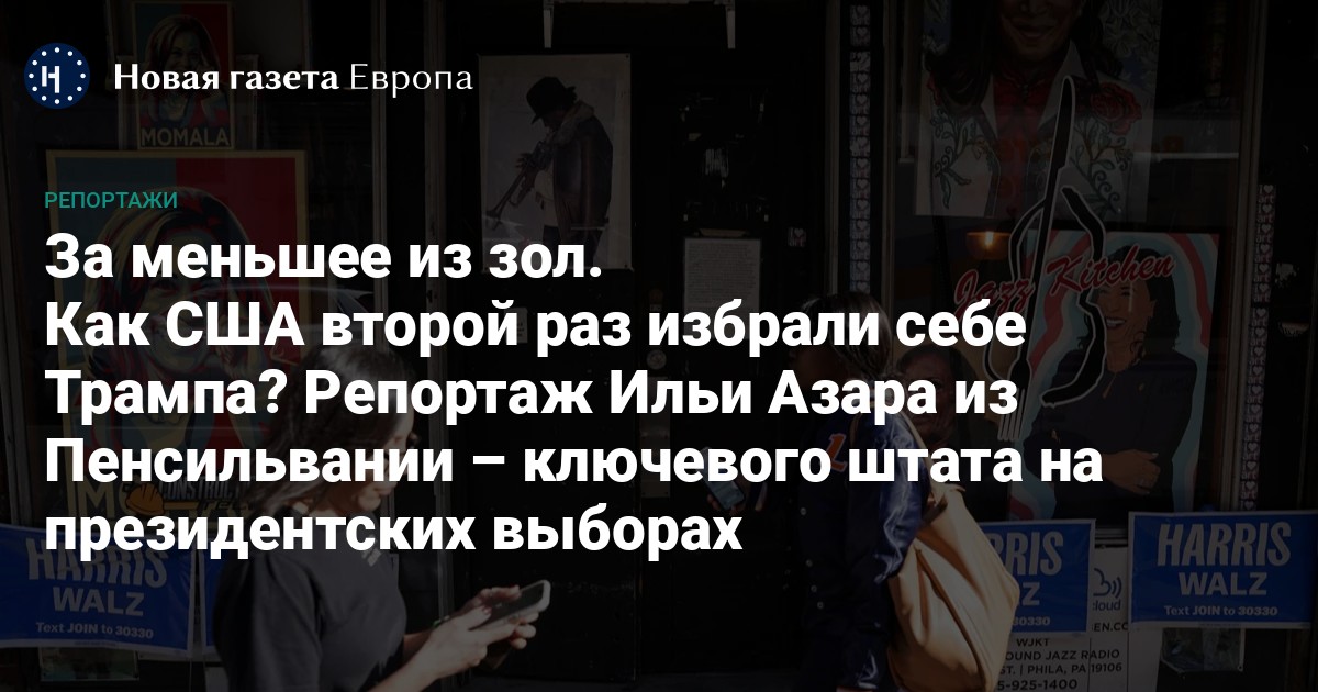 Звездный десант не помог. Дональд Трамп уверенно победил как в целом по стране (295 голосов выборщиков против 226 по состоянию на 7 ноября), так и в Пенсильвании — с преимуществом в 130 тысяч голосов. Специальный корреспондент «Новой газеты Европа» Илья Азар провел в Филадельфии два дня, поговорив как со сторонниками Харрис, так и с проголосовавшими за Трампа жителями русскоязычного пригорода Бастлтон.