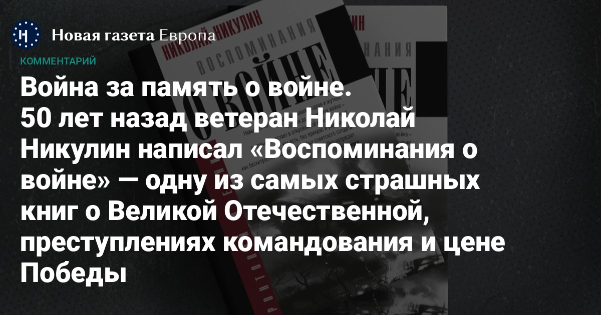В 1975 году известный искусствовед из Эрмитажа Николай Никулин написал мемуары, пытаясь избавиться от тягостных воспоминаний о Великой Отечественной войне, на которую попал в 18 лет. У него получилась жесткая, эмоциональная книга, далекая от квасного патриотизма и критичная к власти. Публиковать ее Никулин не собирался. Но в 2007-м «Воспоминания о войне» неожиданно вышли в издательстве Эрмитажа. Вскоре вокруг мемуаров Никулина разгорелась ожесточенная полемика. Для одних книга стала культовой, для других — преступным очернением Родины. С годами споры вокруг мемуаров не утихли, восторженные и резко критические материалы о них выходят до сих пор.