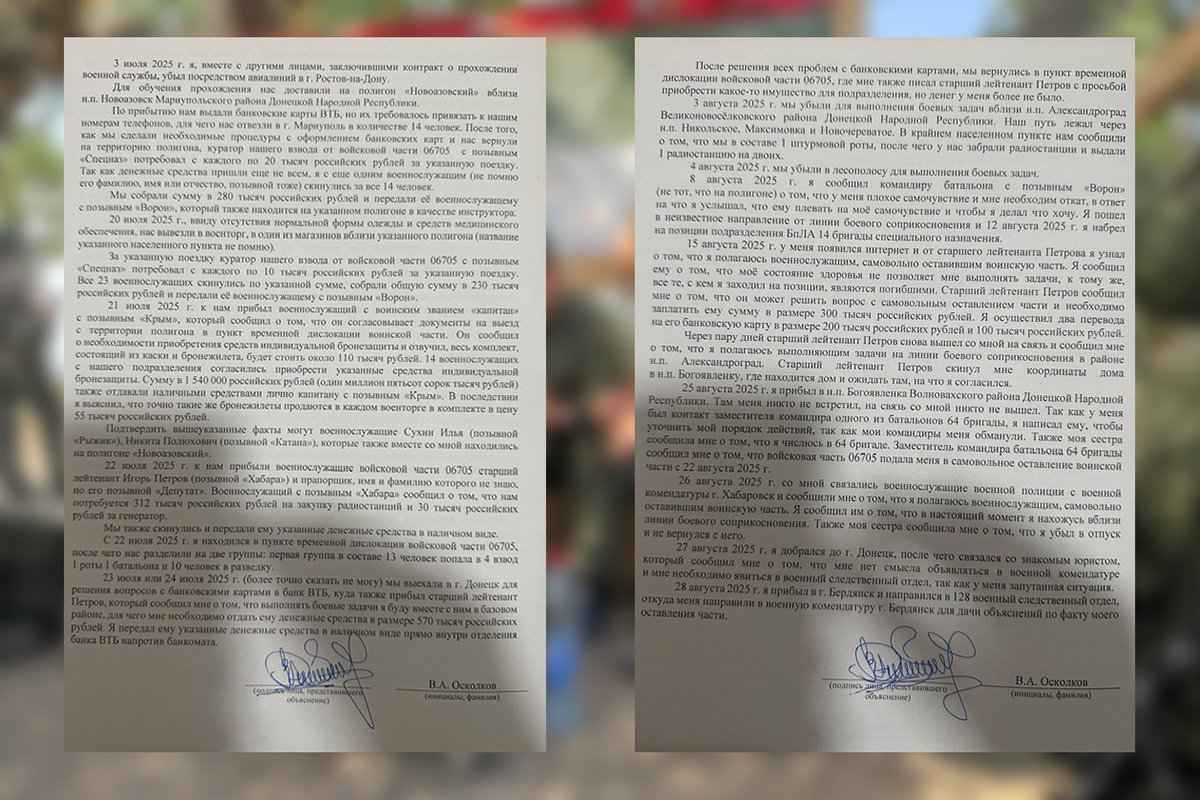 В Бердянске Владимир, как и обещал, дал показания против командования своей воинской части. По его словам, поборы начались еще с учебной части, на полигоне «Новоазовский» в Донецкой области. За каждую поездку с военных брали деньги. За то, чтобы съездить в Мариуполь, оформить банковскую карту, куратор войсковой части 06705 с позывным «Спецназ» взял с каждого по 20 тысяч рублей. За поездку в магазин за «нормальной» одеждой и медикаментами — еще по 10 тысяч. Деньги он передавал военному с позывным «Ворон». Затем военный с позывным «Крым» объявил, что контрактникам нужно скинуться на средства индивидуальной бронезащиты, стоимость одного комплекта — 110 тысяч рублей.
