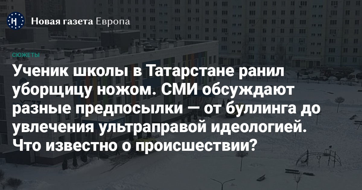 В лицее № 37 Нижнекамска 13-летний ученик во время уроков ранил ножом уборщицу, взорвал петарды и попытался скрыться. Вскоре подростка задержали, и теперь следственные органы и СМИ пытаются выяснить мотивы преступления. Версии разные — от буллинга со стороны одноклассников и расстройства из-за гибели подруги до увлечения неонацистской идеологией.